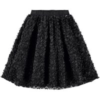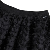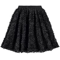 Volumineuze knielange zwarte rok. De rok heeft een prachtig 3D-effect van kleine blaadjes en franjes die een mooi effect geven en een elastische taille waardoor het gemakkelijk aan te trekken is.
