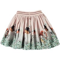 Brenda is een roze ronde rok van biologisch popeline katoen. Brenda heeft een elastische tailleband met twee bordeauxrode strepen. De rok is in de Friends and Flowers print, waarop verschillende dieren genieten van het samenzijn in een bloemenweide.