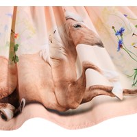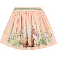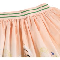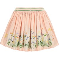Roze rond gesneden rok gemaakt van zacht biologisch katoenen popeline. De taille heeft een brede, gestreepte elastiek die zorgt voor een goede pasvorm en een sportieve twist toevoegt. De knielange rok heeft veel volume en is levendig. De schattige print met het paard tussen kleurrijke bloemen geeft de rok een speelse en fantasierijke uitstraling.