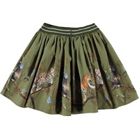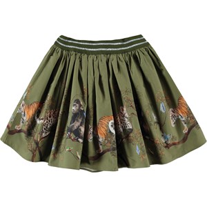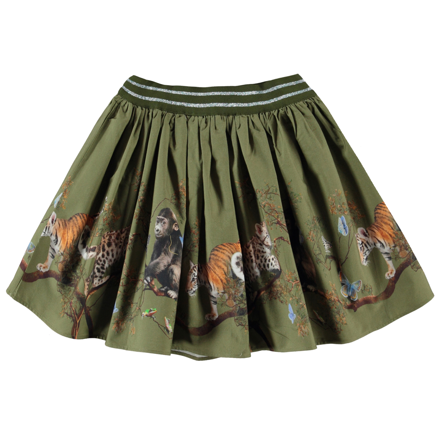 Brenda is een legergroene ronde rok van biologisch popeline katoen. Brenda heeft een elastische tailleband met twee lichtblauwe glitterstrepen. De rok is in de Treetop Cubs print, waarop verschillende jonge dieren samen spelen in de boomtoppen.