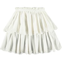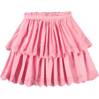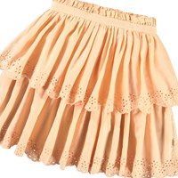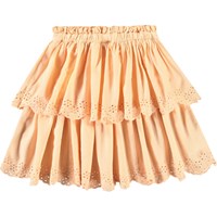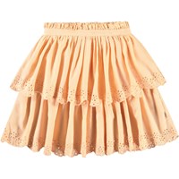 Lichtoranje rok van biologisch katoen. De rok heeft een vaste taille met een ritssluiting, is cirkelvormig gesneden en plooit rond de taille. De rok is halflang en heeft twee rokken in verschillende lengtes met Engels kant langs de boorden. Combineer de rok met een bijpassende top voor een complete set.