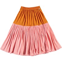 Bridget is een lange en geplooide rok met een oranje bovenkant en een roze onderkant . Het heeft een elastische taille voor een goede pasvorm.