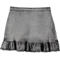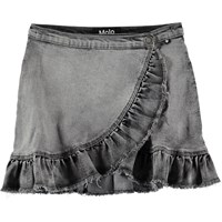 Brigitt is een grijze spijkerrok met rondom een ruche rand en een knoopsluiting aan één kant.