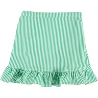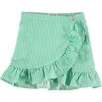 Brigitt is een groen en wit gestreepte rok. Het heeft een schuine knoopsluiting en een wikkeleffect met een ruche.