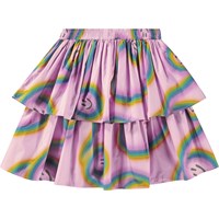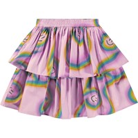 Roze rok van biologisch katoen met een print van zwevende regenbogen die veranderen in lachende gezichten. De rok is van gemiddelde lengte en heeft twee lagen van verschillende lengtes, evenals een elastische tailleband, waardoor het gemakkelijk aan en uit te trekken is.