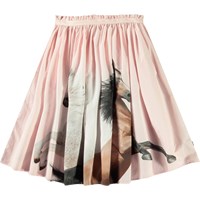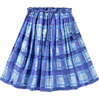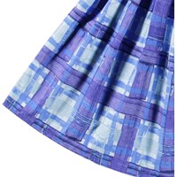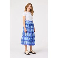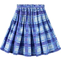 Blauwe geblokte knielange rok van biologisch katoen. De rok heeft een vaste taille aan de voorkant, terwijl het aan de achterkant elastisch is voor gemakkelijk dragen. De rok is cirkelvormig en plooit rond de taille.