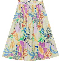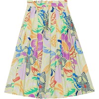 Lichtgroene knielange rok van biologisch katoen. Het heeft aan de voorkant een gladde tailleband en aan de achterkant is het elastisch, zodat je de rok makkelijk aan kunt trekken. De rok is rond en heeft plooitjes in de taille. Het heeft een kleurrijke bloemenprint.