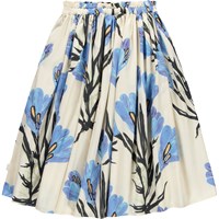 Gebroken witte knielange rok gemaakt van zachte biologische katoenpopeline met een mooie print van blauwe bloemen. De rok heeft een vaste tailleband met een fijne kleine ruche aan de voorkant, terwijl elastiek aan de achterkant het gemakkelijk maakt om het aan en uit te trekken. De rok heeft een cirkelvormige ontwerp en is rondom de taille geplooid, wat een lichte en levendige drapering geeft.
