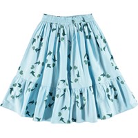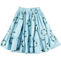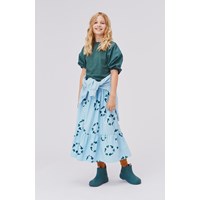 Britta is een lange lichtblauwe rok met een print van gerecyclede hartjes. De rok is van katoen en heeft een elastische taille.