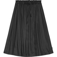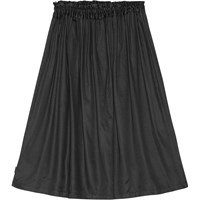 Stoffige zwarte rok gemaakt van zachte viscose. De rok valt zwaar en elegant tot halverwege het onderbeen en heeft een elastische taille met koordjes waardoor hij gemakkelijk aan en uit te trekken is.