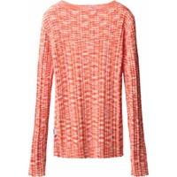 Trui gemaakt van een viscosemix. De trui is geribbeld in een aansluitende pasvorm, een ronde hals en onbewerkte boorden rond de mouwen en taille. De trui is geweven in oranje en witte kleuren, wat zorgt voor een mooie textuur.