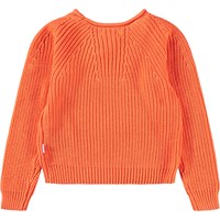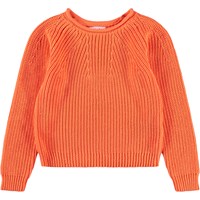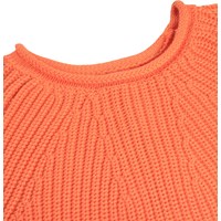 Oranje gebreide trui gemaakt van zachte biologische katoen met een ronde hals. De trui heeft een ruimvallende pasvorm, heeft een gebreide ribpatroon met fijne toenamen en afnamen en ribboorden rond de mouwen en onderkant.