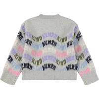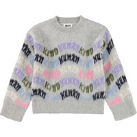 Grijze oversized trui van wol met een kleurrijke patroon en de tekst ''Humankind'' er helemaal omheen geweven. De trui heeft een ruimvallende pasvorm en ribboorden rond de hals, mouwen en taille.