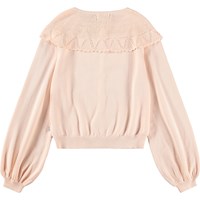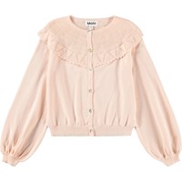 Lichtroze gebreid vest van zacht, biologisch katoen met een prachtige ronde bovenstuk. Het vest heeft een klassieke pasvorm met knopen aan de voorkant en licht gepofte mouwen met ribboorden, wat een elegant balloneffect creëert.