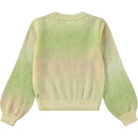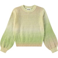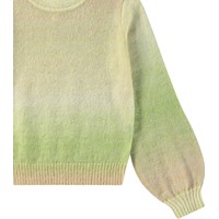 Trui van zacht wol in beige en groene kleuren. De trui is dun en licht en heeft een ruimvallende pasvorm met ronde hals en ribboord rond de mouwen, hals en de onderkant.