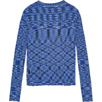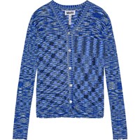 Deze aansluitende vest is genaaid met een mouliné effect, wat zorgt voor een gevarieerde en unieke pasvorm. De vest heeft lange mouwen en sluit met parelmoeren knopen. Er zijn overlock boorden rond de mouwen en onderkant voor extra details.