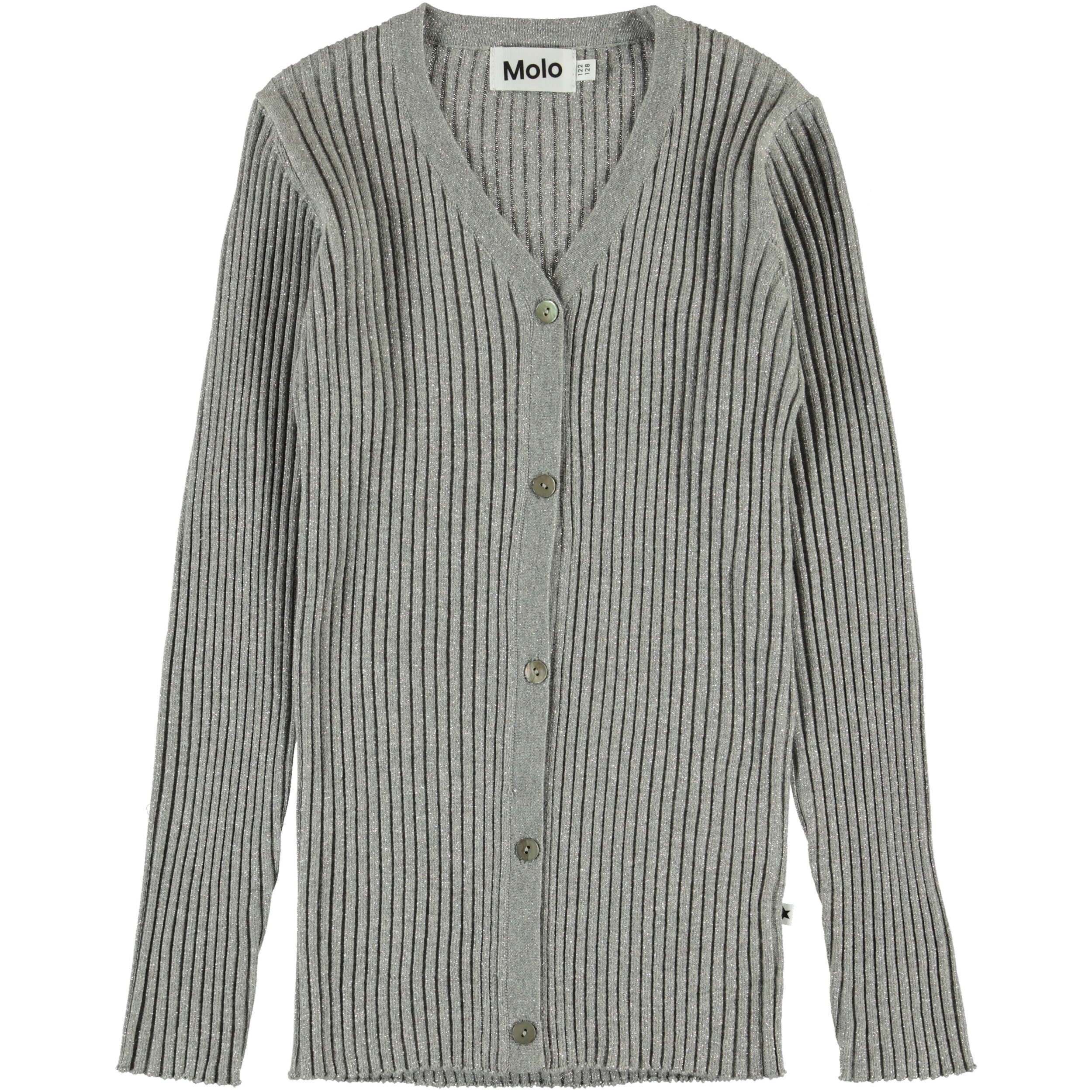 Genie is een lang, grijs vest van ribstof met een knoopsluiting aan de voorzijde. Het vest heeft een v-hals en is van 100% katoen met glitter.