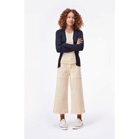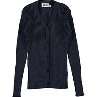 Genie is een lange donkerblauwe vest met glitter. Het heeft een v-hals en een knoopsluiting.
