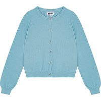 Blauwe gebreide vest van biologisch katoen in een fijn gebreid patroon. De vest heeft knoopsluiting en fijne geribbelde boorden rond de hals, mouwen en taille. Het is rekbaar en biedt veel bewegingsvrijheid.