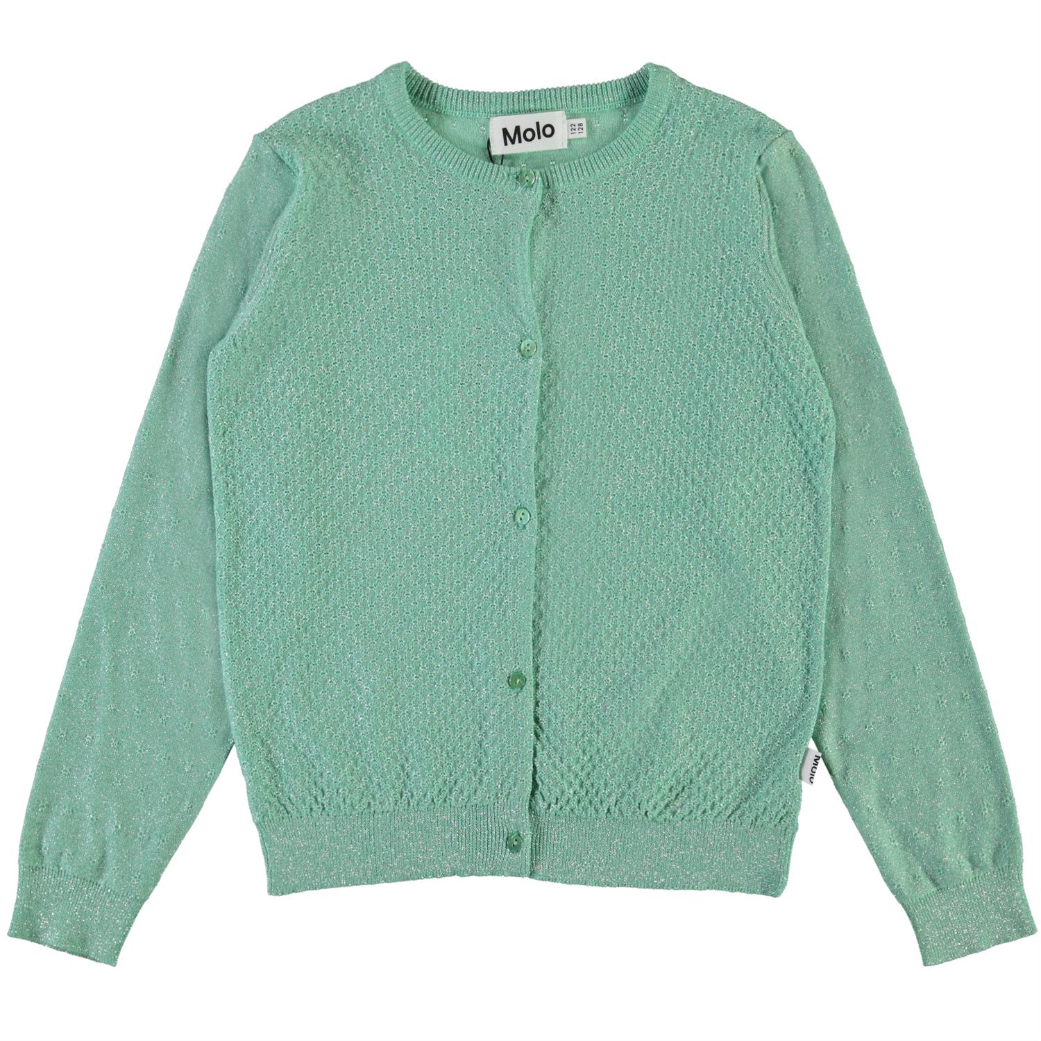 Georgina is een groene katoenen vest. Het heeft een ribbelsteek breipatroon en een knoopsluiting.