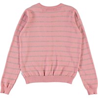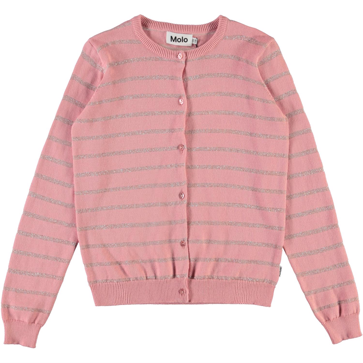 Georgina is een roze katoenen vest met zilveren strepen. Het heeft een ribbelsteek breipatroon en een knoopsluiting.
