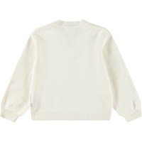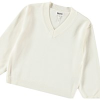 Zachte witte gebreide katoenen kindertrui met een v-hals en ribboord rond de hals, mouwen en onderkant. De trui heeft een ruimvallende pasvorm en is comfortabel om te dragen.