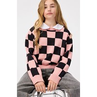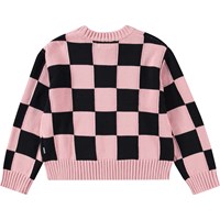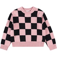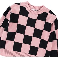 Gebreide zwart en roze geblokte trui van zacht katoen. De trui heeft roze gebreide ribboorden rond de hals, mouwen en onderkant, wat zorgt voor een mooie afwerking. Het een ronde hals en een ruimvallende pasvorm en is met elke stijl makkelijk te combineren.