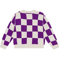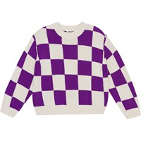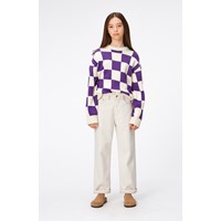 Gebreide katoenen korte trui met paarse en gebroken witte blokken. Het heeft een ribgebreide hals, onderkant en mouwen die het een mooie afwerking geven. Het truitje heeft een ronde hals en een ruimvallende pasvorm, waardoor je hem gemakkelijk over een jurkje of blouse kunt aantrekken.