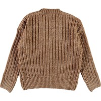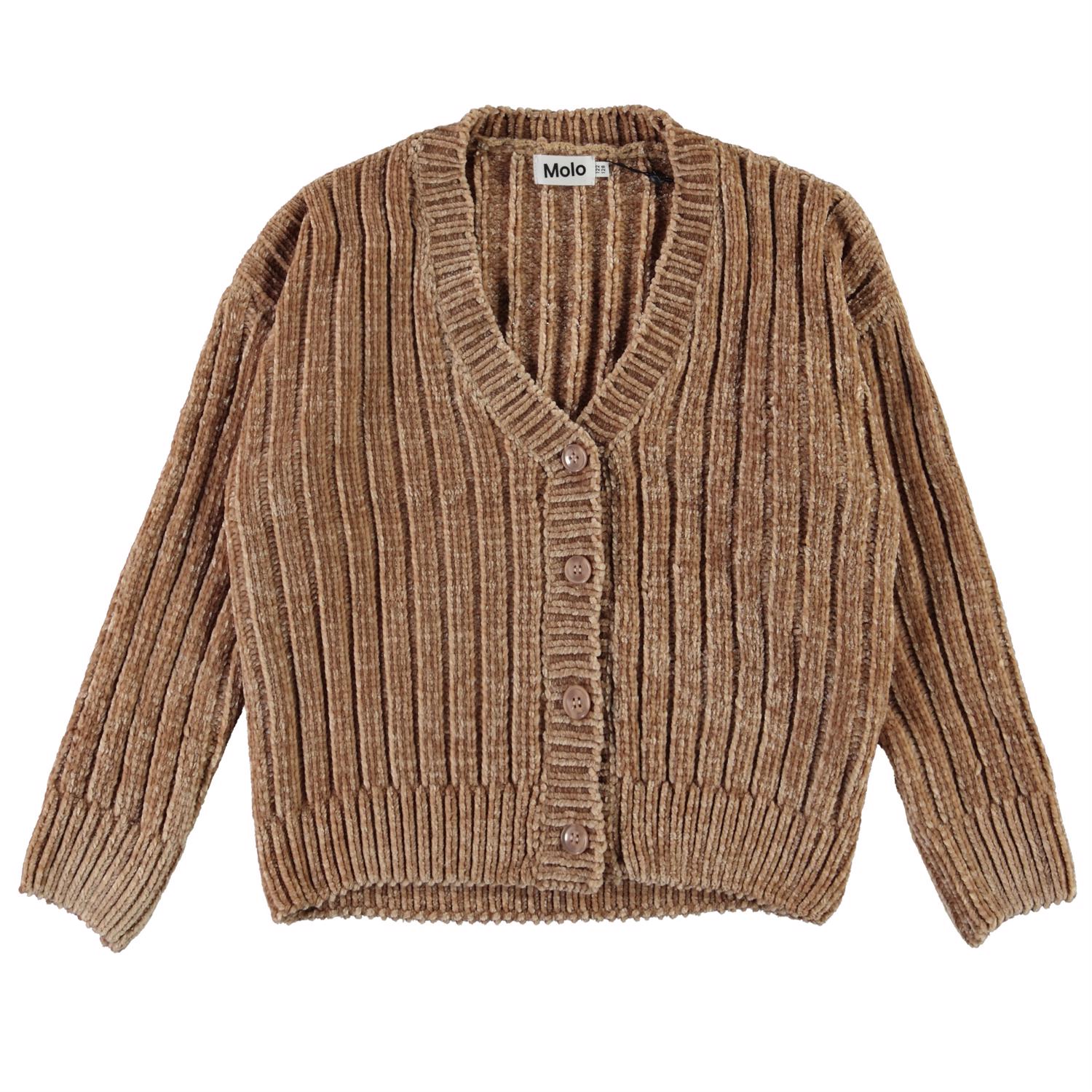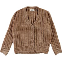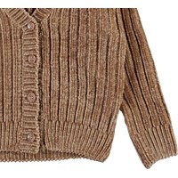 Gianna is Molo's nieuwe chenille gebreide vest in bruin. Het heeft een v-hals, een korte pasvorm en een knoopsluiting.