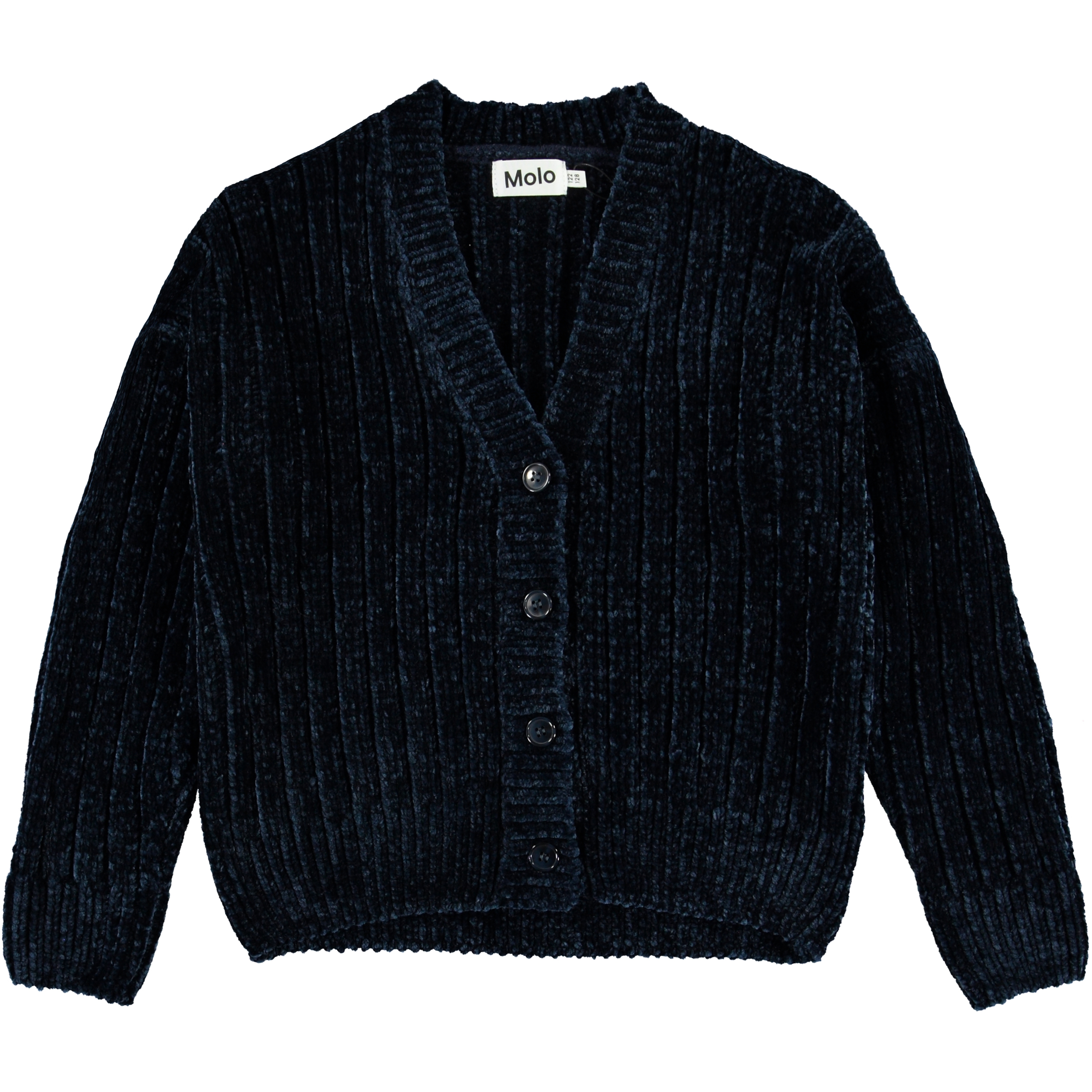 Gianna is Molo’s nieuwste gebreide chenillevest in donkerblauw. De vest is kort en heeft een V-hals en knoopjes aan de voorkant.