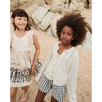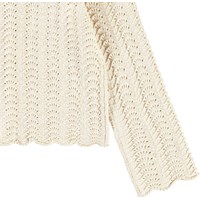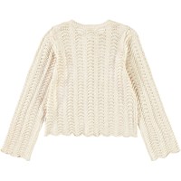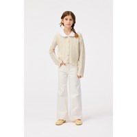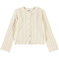 Gebroken witte gebreide vest van zacht bioloigsch katoen in een prachtig breipatroon met golvende boorden rond de mouwen en onderkant. Het vest heeft een normale pasvorm en aan de voorkant parelmoeren knoopjes en ribboord rond de hals.