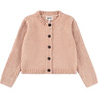 Roze vest van chenille garen. Dit vest heeft een knoopsluiting aan de voorkant en rib gebreide mouwen en ribboorden rond de hals en taille.