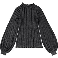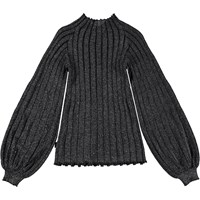 Gilah is een donkergrijze trui in rib. De trui heeft een hoge kraag en wijde mouwen.