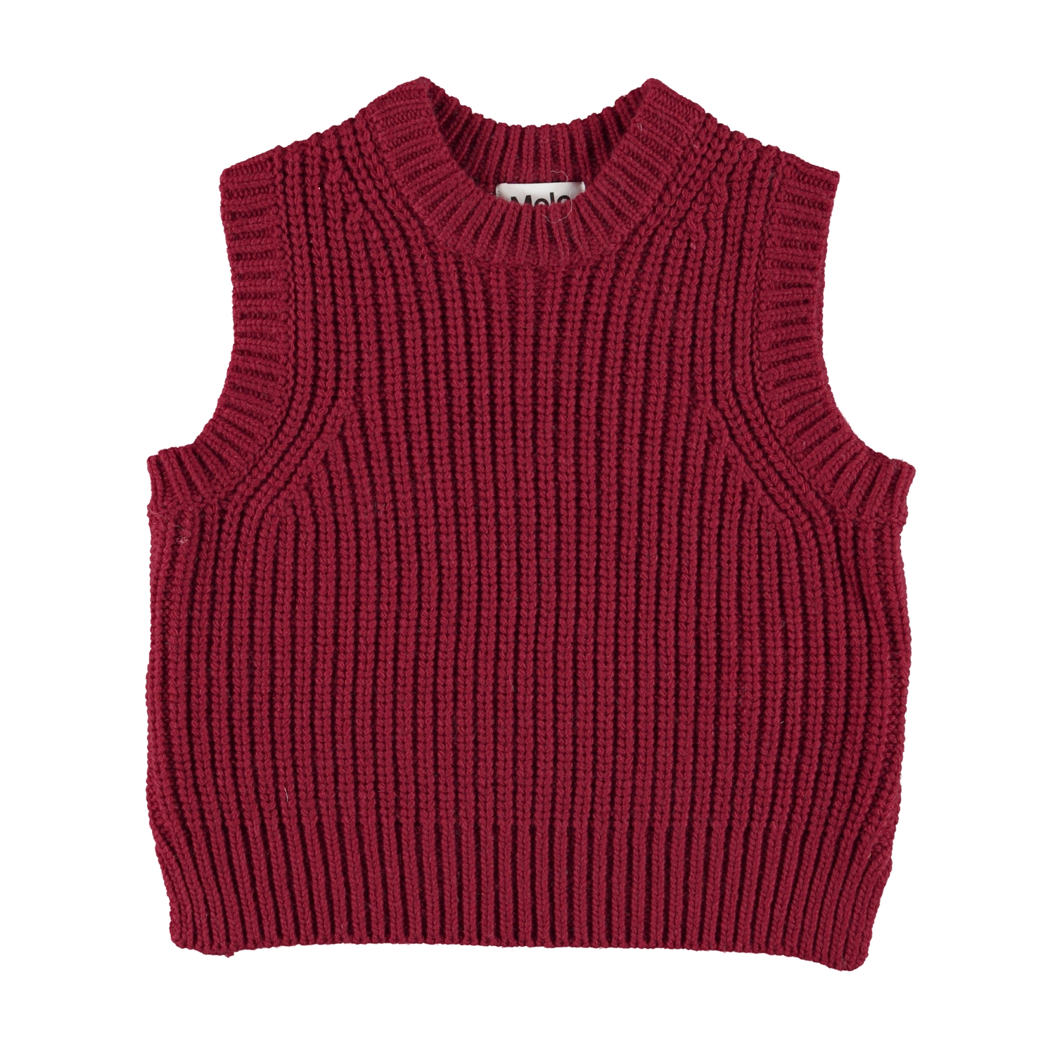 Gilberte is een donkerrode gebreide spencer. Het heeft een ronde hals en splitten aan de zijkanten.