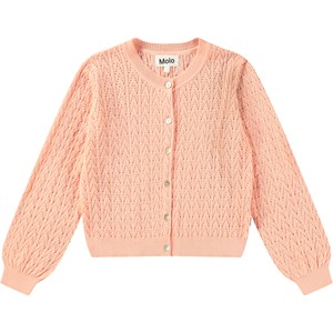 Lichtoranje gebreide vest van zacht biologisch katoen in een prachtig breipatroon. Het vest heeft een normale pasvorm, parelmoerknoopjes aan de voorkant en ribboord rond de hals, mouwen en onderkant.