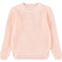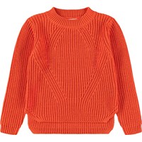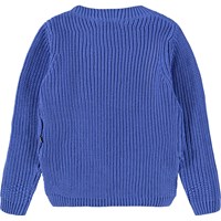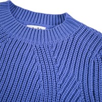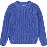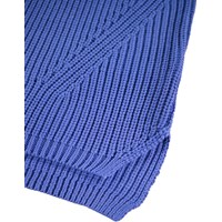 Blauwe gebreide trui gemaakt van zacht biologisch katoen met een ronde hals. De trui heeft een ruimvallende pasvorm, een fijn ribpatroon, extra lengte aan de achterkant en splitten aan de zijkanten.