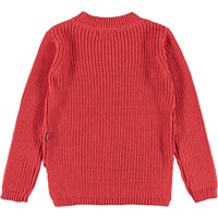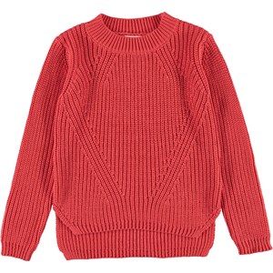 Gillis is een rode gebreide katoenen trui. Het heeft een ronde hals en een prachtig patroon.