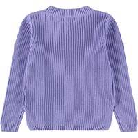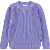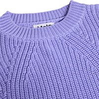 Paarse gebreide trui gemaakt van zachte biologische katoen met een ronde hals. De trui heeft een ruimvallende pasvorm, heeft een ribpatroon met fijne toenamen en afnamen en het heeft extra lengte aan de achterkant en zijsplitten.