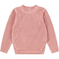 Groene gebreide trui van zacht biologisch katoen met een ronde hals. De trui heeft een ruimvallende pasvorm in een ribpatroon met mooie details. Het is langer aan de achterkant en heeft splitjes aan de zijkant.