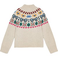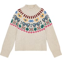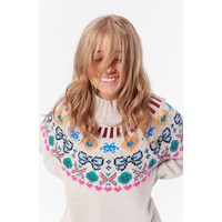 Beige gebreide trui van een zachte wol/acryl mix. Ronde hals met gebreide ribbels. Raglanmouwen en gebreide ribbels rond de mouwen en taille. Het patroon loopt van de voorkant naar de achterkant en is geïnspireerd op Noordse breitradities. Gepixelde patroon met hartjes, strikjes en smileys in verschillende kleuren.