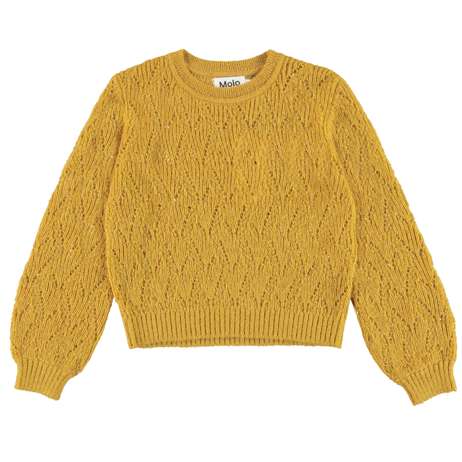 Ginger is een gele gebreide trui in een prachtig patroon en bell mouwen.