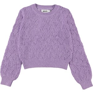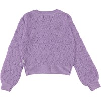 Ginger is een paarse gebreide trui met lange mouwen in een fijne brei kwaliteit. Ginger heeft een prachtig patroon en heeft gebreide rijboorden rond de hals, mouwen en onderkant.