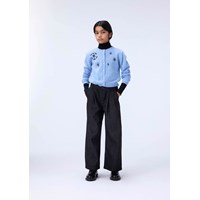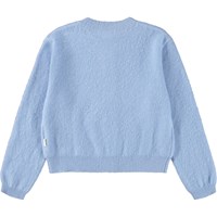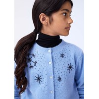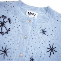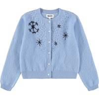 Mooie lichtblauwe vest gemaakt van licht geborstelde wol. De vest heeft een delicaat patroon van ijskristallen aan de voorkant, fijne parelmoeren knopen en ribboorden rond de hals, mouwen en taille.