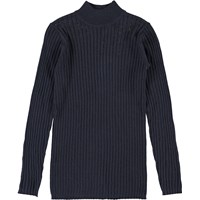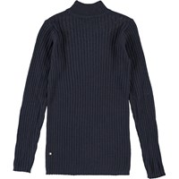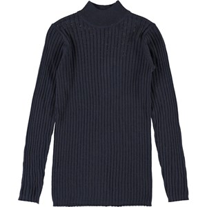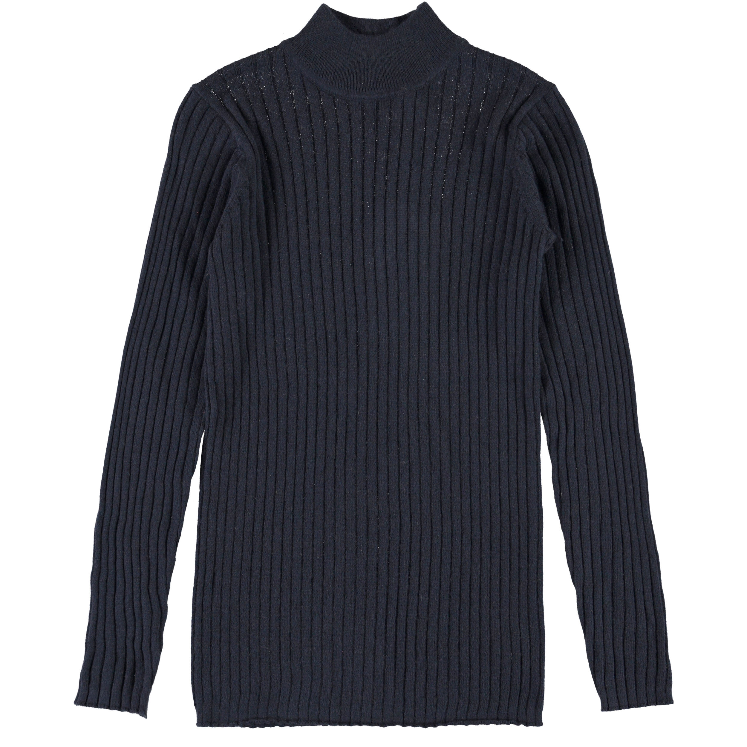 Gitte is een donkerblauwe gebreide trui met een kol.