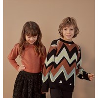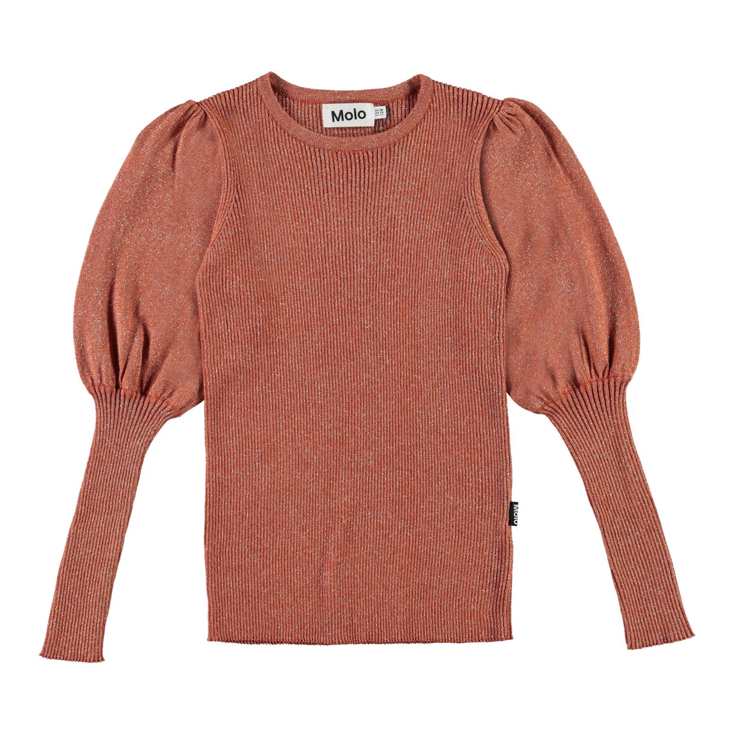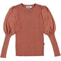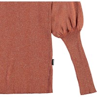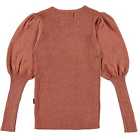 Glenda is een bruin/rode gebreide trui met lange pofmouwen. Het is in een rib patroon met een glitterdraad wat het extra elegant maakt.