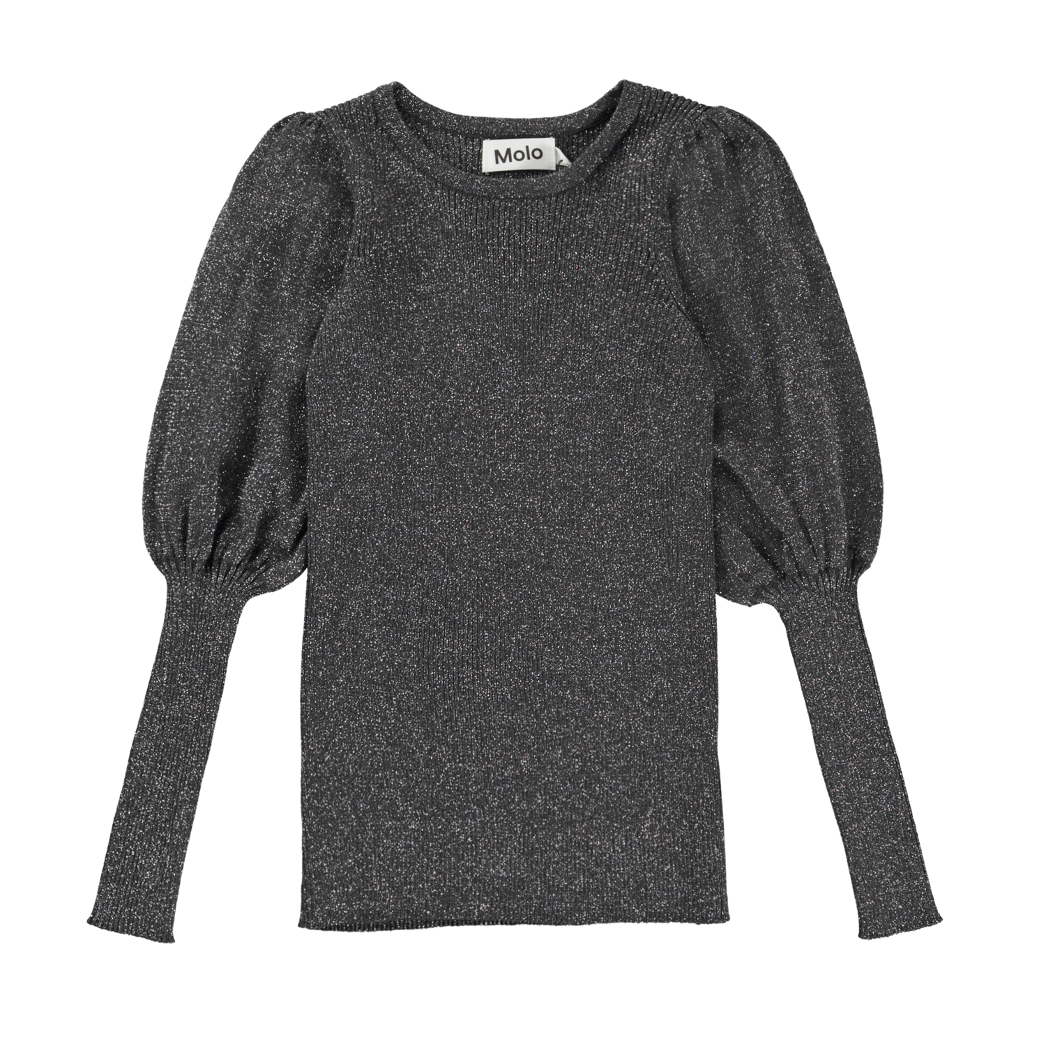 Glenda is een donkergrijze trui met lange mouwen die aan de bovenkant een vol pof effect hebben. De trui in gebreid in een rib patroon met een glitterdraad, wat het erg elegant maakt.