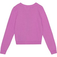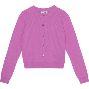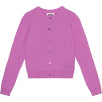 Paarsroze vest van zacht biologisch katoen. Het is gebreid in een delicate brede rib met een smallere rib rond de hals, mouwen en onderkant. Het heeft lange mouwen en knopen aan de voorkant. Het vest heeft een mooie vorm.