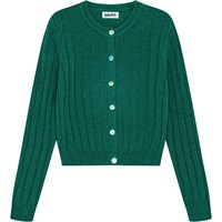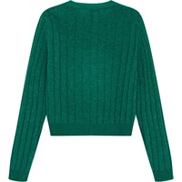 Groene vest van wol. De vest is fijn gebreid met een brede ribbel en heeft een smallere ribbelboord rond de hals, mouwen en zoom. Het heeft parelmoeren knopen aan de voorkant en sluit nauw aan op het lichaam.