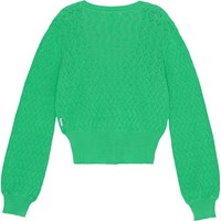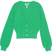 Groene gebreide vest in een mooi patroon. Het heeft een ribgebreide hals en sluiting met drie parelmoerkleurige knopen. Er is ook ribboord rond de raglanmouwen en onderkant. Het vest is iets getailleerd en heeft volle mouwen.