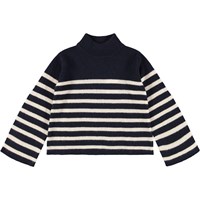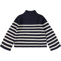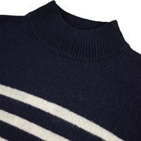 Stoere coltrui van wol. De trui heeft een schouderstuk in donkerblauw met strepen in blauw en wit en een mooie geribbelde kraag.
